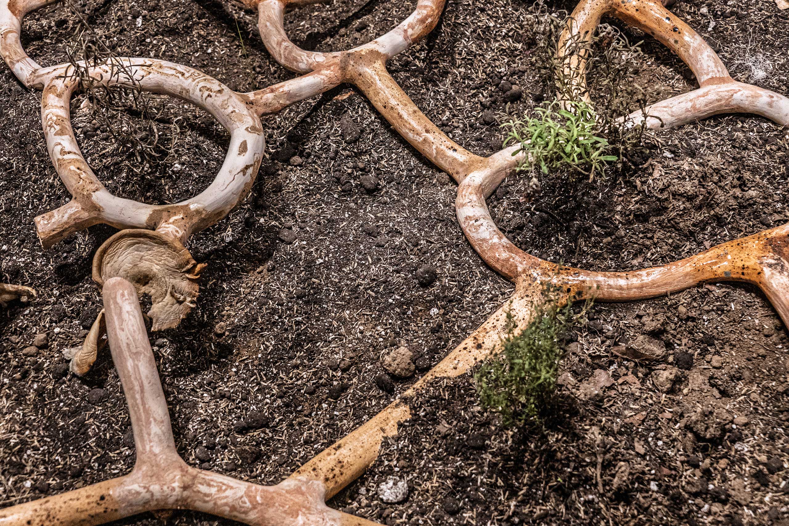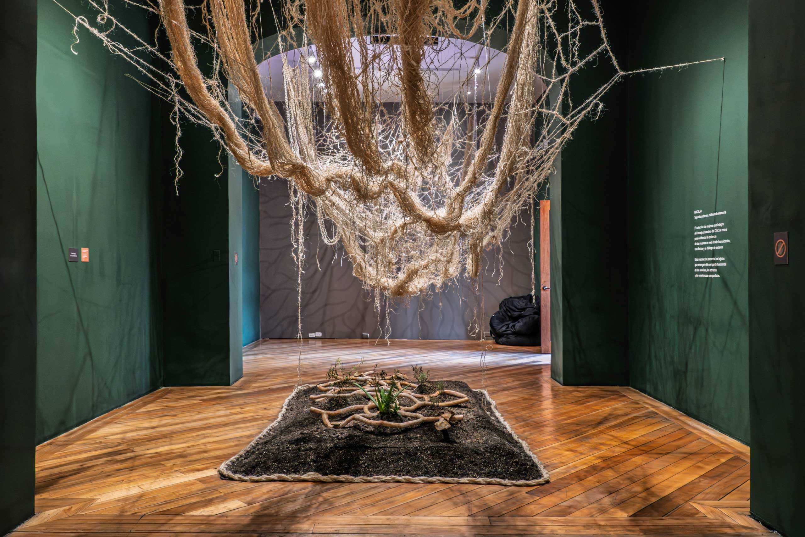 Se trata de una instalación que integra capas de suelo, amuletos y elementos de la botica herbal, concebidos como símbolos de sanación, memoria y resistencia. La pieza propone una reconexión con la tierra, el agua, el fuego y el aire, y entiende la práctica artística como un laboratorio vegetal y espiritual, donde el arte se transforma en botica, círculo de raíz y espacio de convivencia.