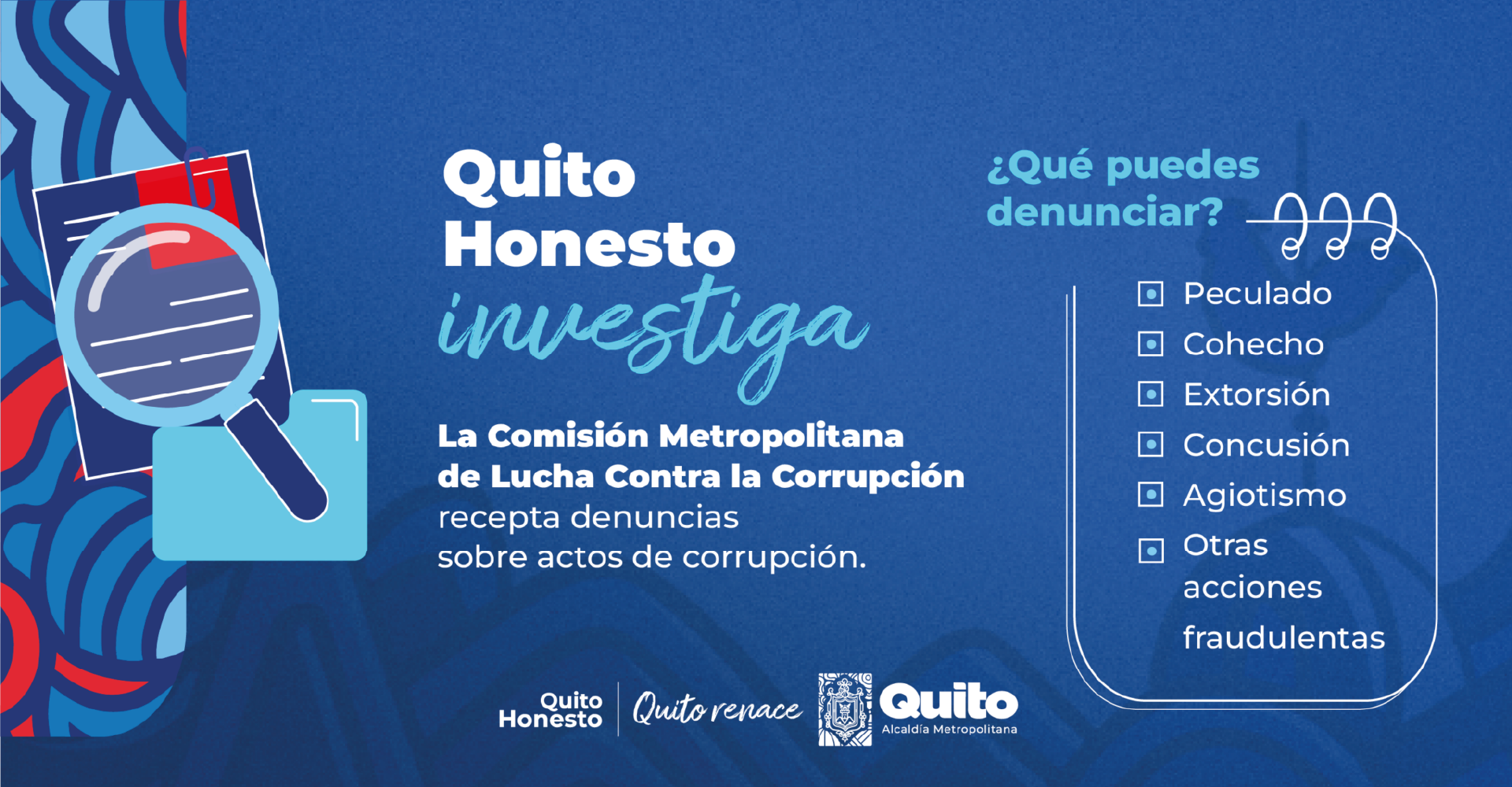 Canales de denuncia Formulario Accede al formulario de denuncias web que mantiene la Comisión Metropolitana de Lucha Contra la Corrupción – Quito Honesto: VER FORMULARIO Aplicación Descarga el aplicativo para Android e IOS: “Quito Honesto” IOS ANDROID Contacto Dirección: Av. Amazonas N21-252 y Jerónimo Carrión, edificio Londres, tercer piso Mail: denuncias@quitohonesto.gob.ec